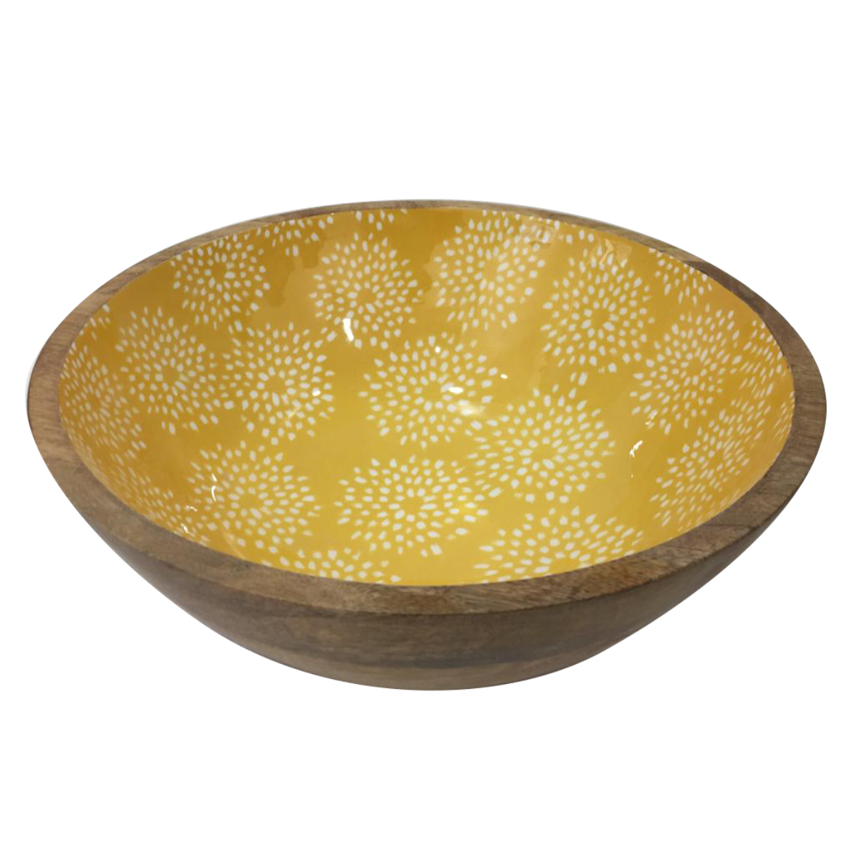 Fabriqué à partir de bois de manguier, l'extérieur de ce saladier présente une teinte boisée riche et chaleureuse, parfaite pour ajouter une touche organique et élégante à votre décoration. L'intérieur du saladier est laqué d'un jaune vif et joyeux, orné de petits points blancs formant des motifs floraux délicats, évoquant les champs ensoleillés et les jardins fleuris.