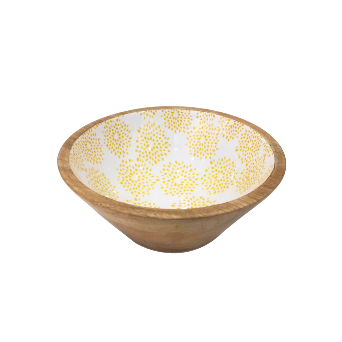 Avec un diamètre de 20,5 cm et une hauteur de 7,5 cm, ce saladier plus petit présente une contenance d'environ 1230 ml, idéale pour des portions individuelles de salades, fruits ou accompagnements. La combinaison de jaune et de bois crée un contraste subtil et élégant. Chaque saladier est vendu à l'unité, garantissant une pièce unique reflétant un artisanat.