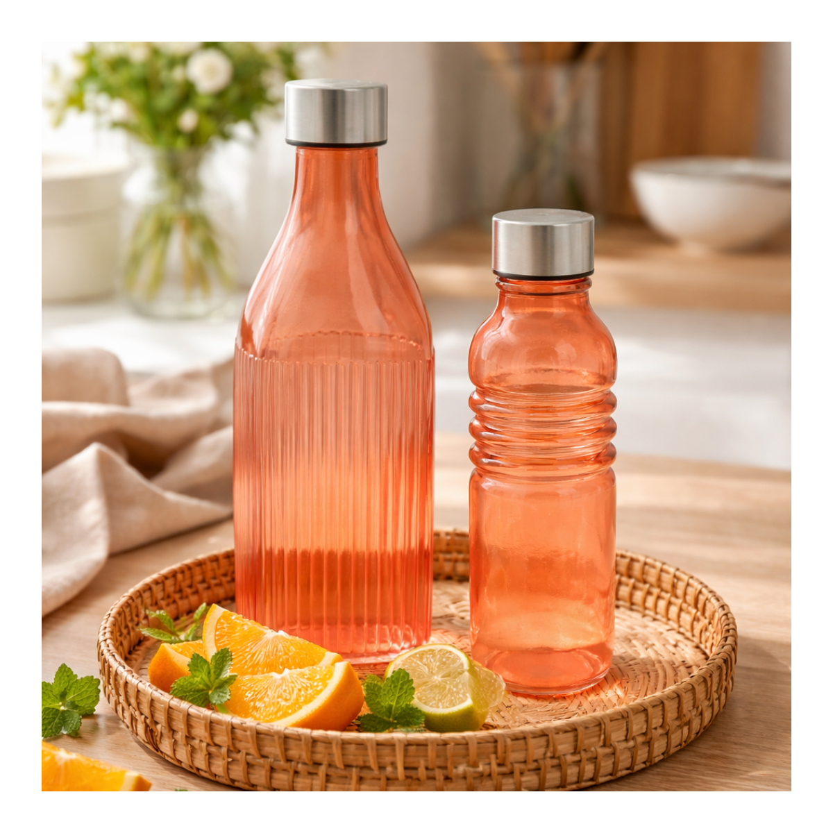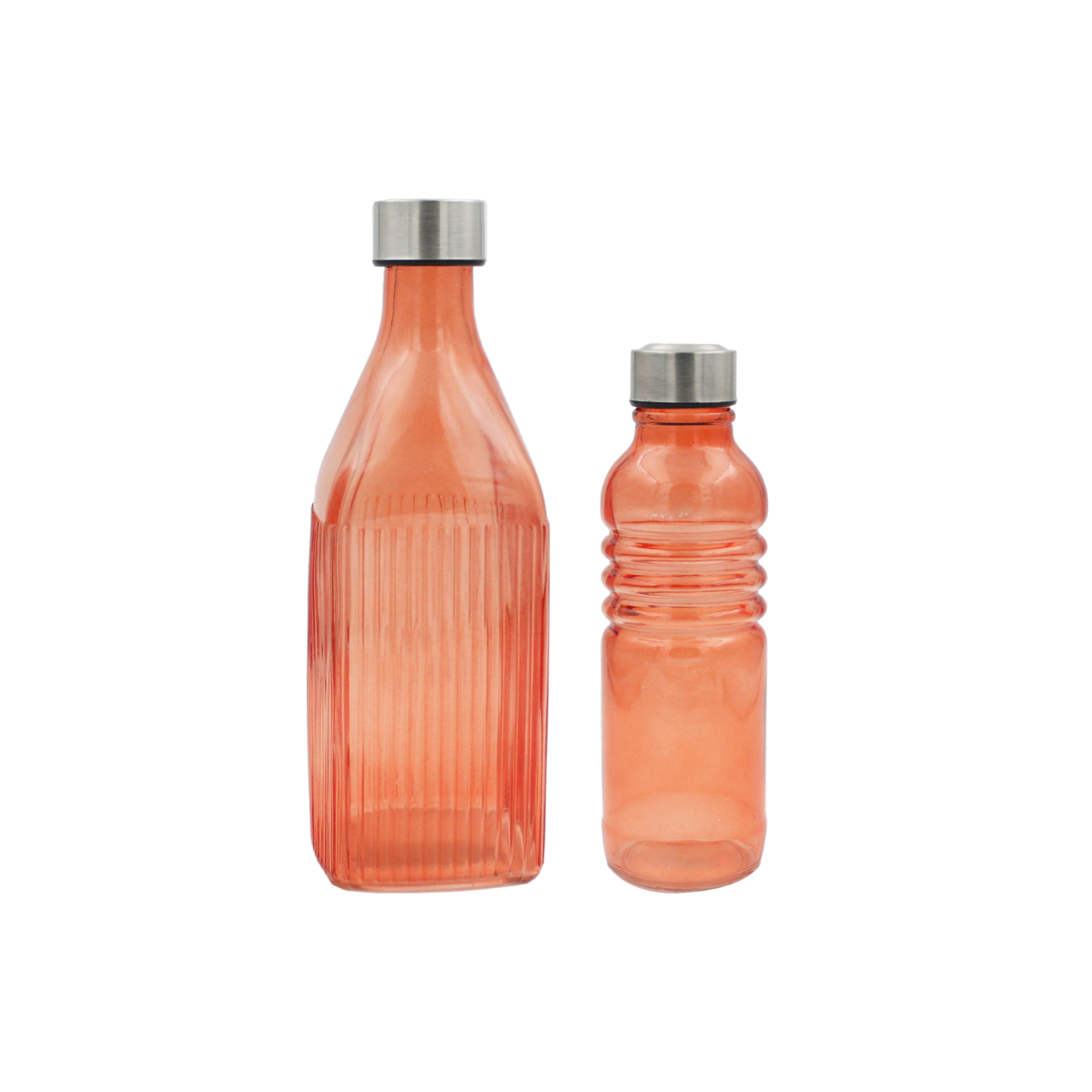 Conçues en verre épais de qualité, elles se distinguent par leur design strié élégant et leur teinte chaleureuse, qui apportent immédiatement du caractère à votre table. Leurs bouchons hermétiques en inox assurent une bonne conservation des boissons tout en ajoutant une finition moderne et raffinée.