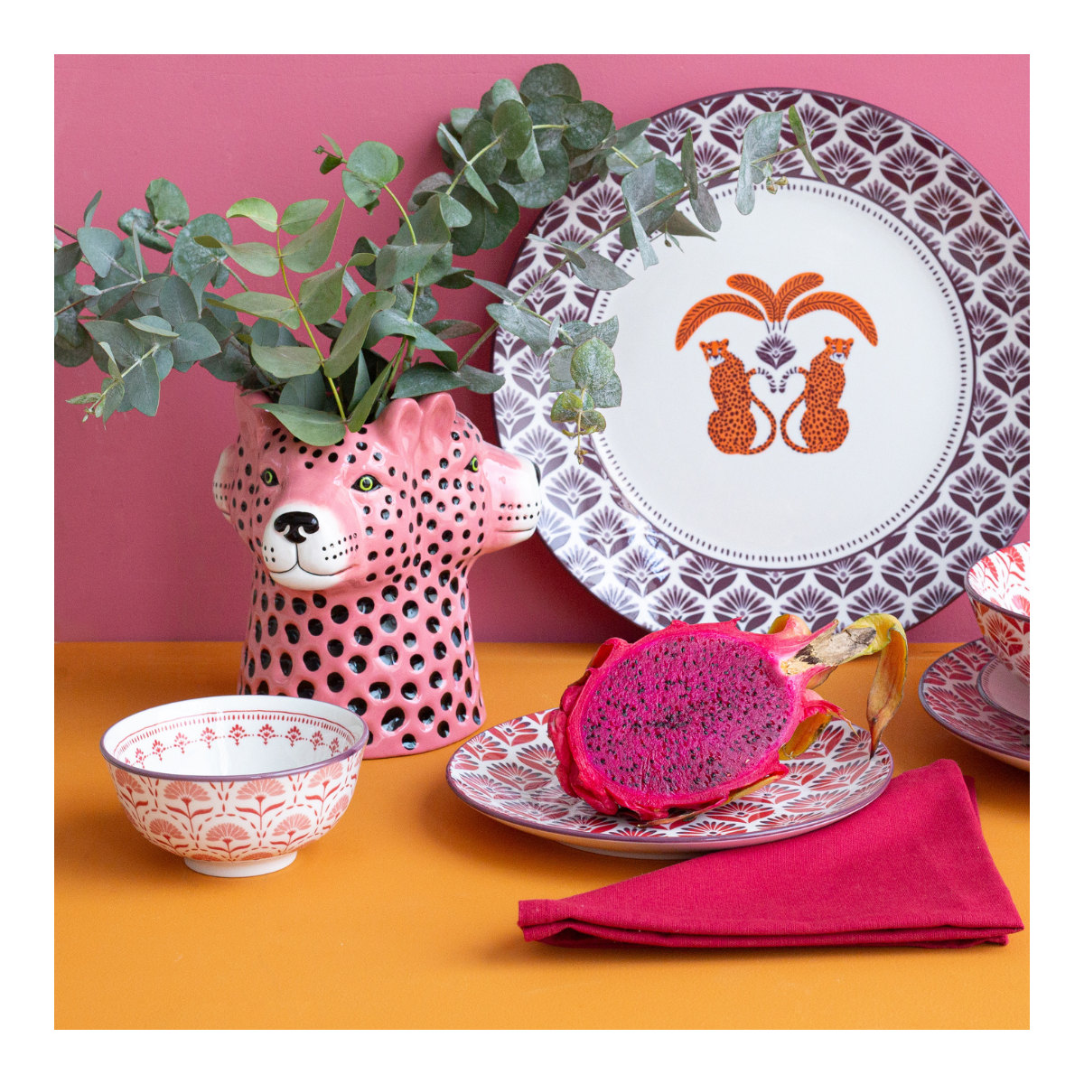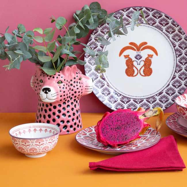 Chaque pièce présente un design unique mêlant motifs décoratifs et représentations d’animaux comme léopards, éléphants ou oiseaux, dans des teintes chaleureuses d’orange, de rouge et de vert. Ces détails apportent une touche exotique et originale qui attire le regard et sublime vos repas.